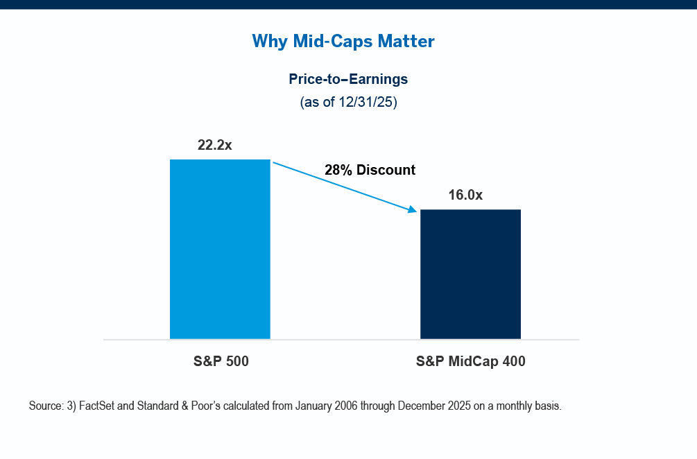 1,3FactSet as of 12/31/25. Consensus EPS growth for the S&P MidCap 400 Index is projected to grow -1.1% in 2025 and 19.5% in 2026. Consensus EPS Growth for the S&P 500 Index is projected to grow 11.6% in 2025 and 14.9% in 2026.